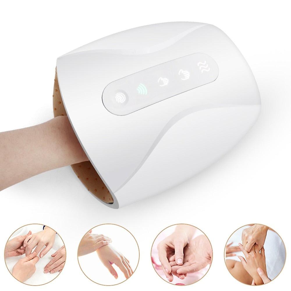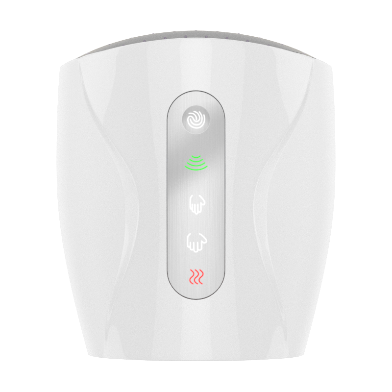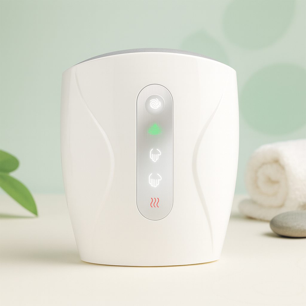 Place your hand inside, choose intensity and heat. Automatic 15-min session. Use 1–2×/day as needed.