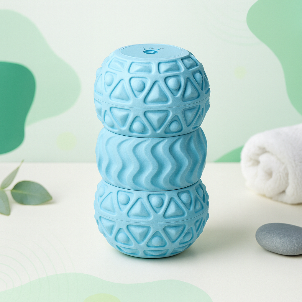 Power on, choose intensity, and roll under the arch of the foot or over the muscle for 5–10 min per area. Use before/after training or at the end of the day.